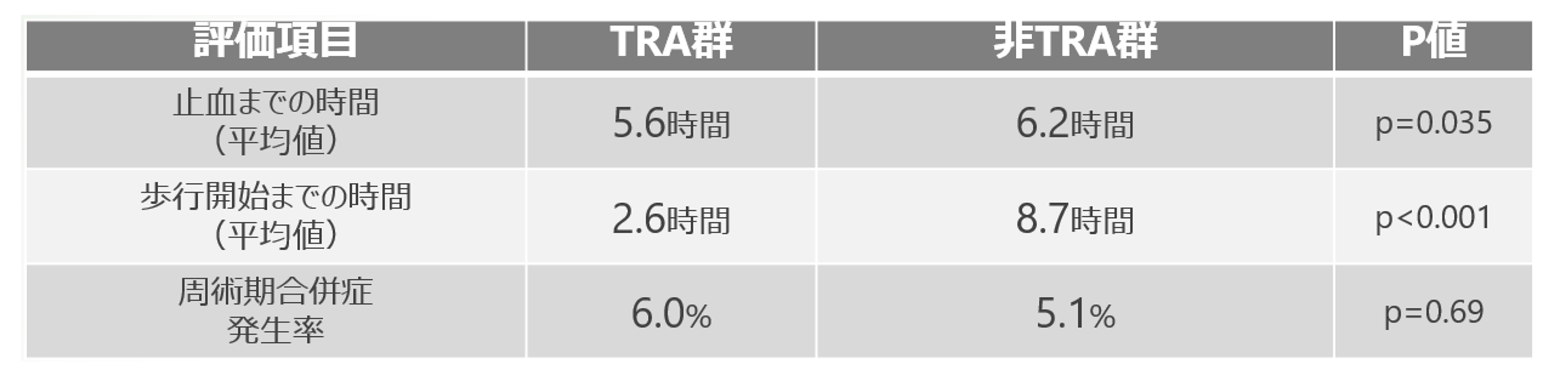 * COMFORT研究において、TRA群は非TRA群に比して止血までの時間と歩行開始までの時間が短かった。